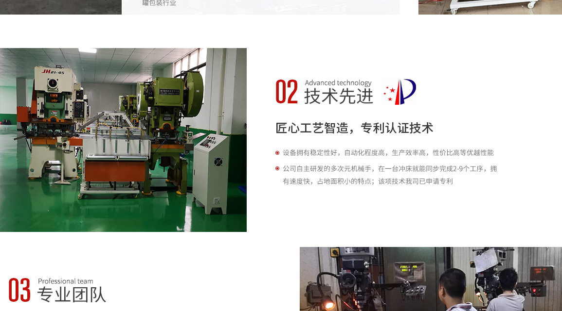 罐身自動扣骨機生產:茶葉罐/酒罐/化妝品罐/內衣罐等等. 其中多次元機械手專為兩片盒的生產和三片罐的蓋、底、蓋圈、拍底蓋等的生產而設計,...